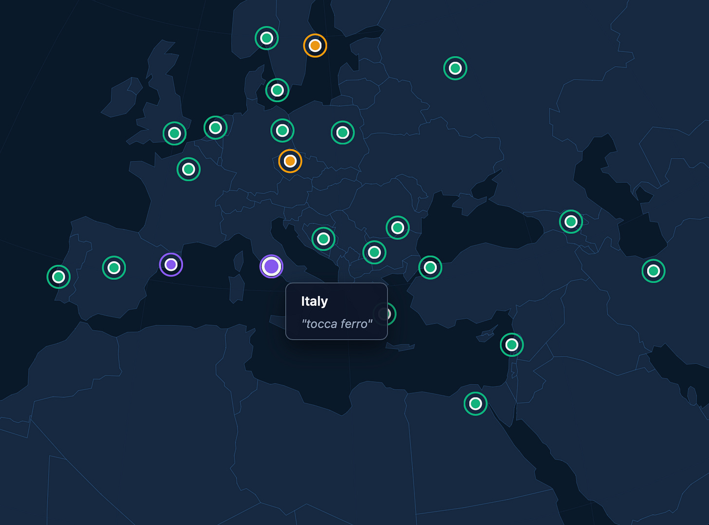 What we see is that there are in fact two entangled traditions of “knocking on things for good luck”: touching iron, and touching wood. We also find that they are widely distributed, but also have a pretty clear cluster around the Mediterranean and Europe.