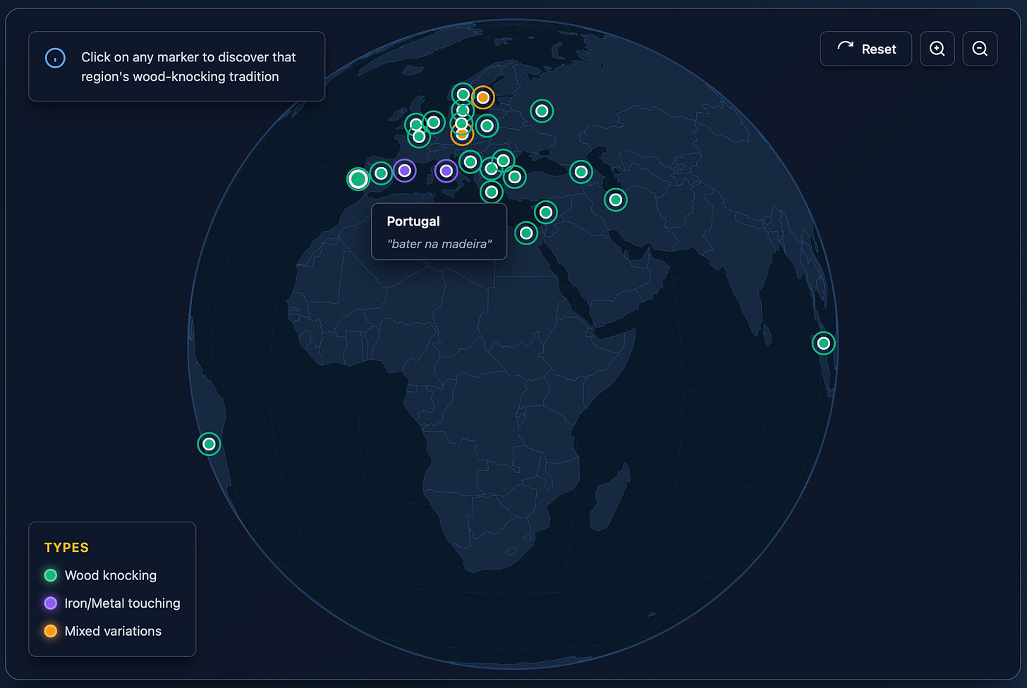 This is where historical data visualizations — of the type Claude Code can now produce on cue — can come in handy. I downloaded a scientific paper about knocking on wood along with the crowd-sourced Wikipedia list, then provided it to Claude Code and asked it to plot the data on a three.js globe. Here’s the interactive version and the GitHub page.