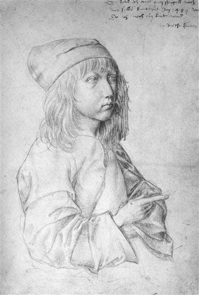 There are, of course, several more famous child-authored artworks from the medieval and early modern periods. Probably the most famous are these two self-portraits by two extremely talented fifteenth-century teenagers: Albrecht Dürer and Raphael.