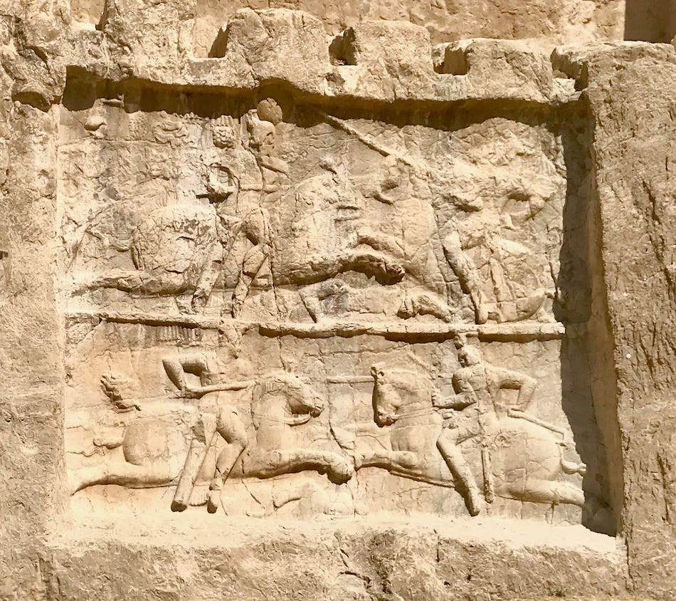 I remember spending at least a week studying the site in an art history class I took as an undergrad, and I can still remember my professor — the witty and erudite David Castriota — describing this Sassanian bas relief as the first depiction of the new technology (mounted, armored warriors on horseback with lances) that would evolve into the medieval knight. It was amazing to see it in person: