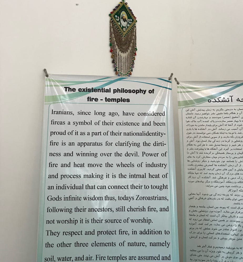 Zoroastrians are few in numbers in today’s Iran (numbering in the low tens of thousands) and face religious persecution, but they still exist as an active religious movement. It was fascinating to see a place where they remain a large minority.