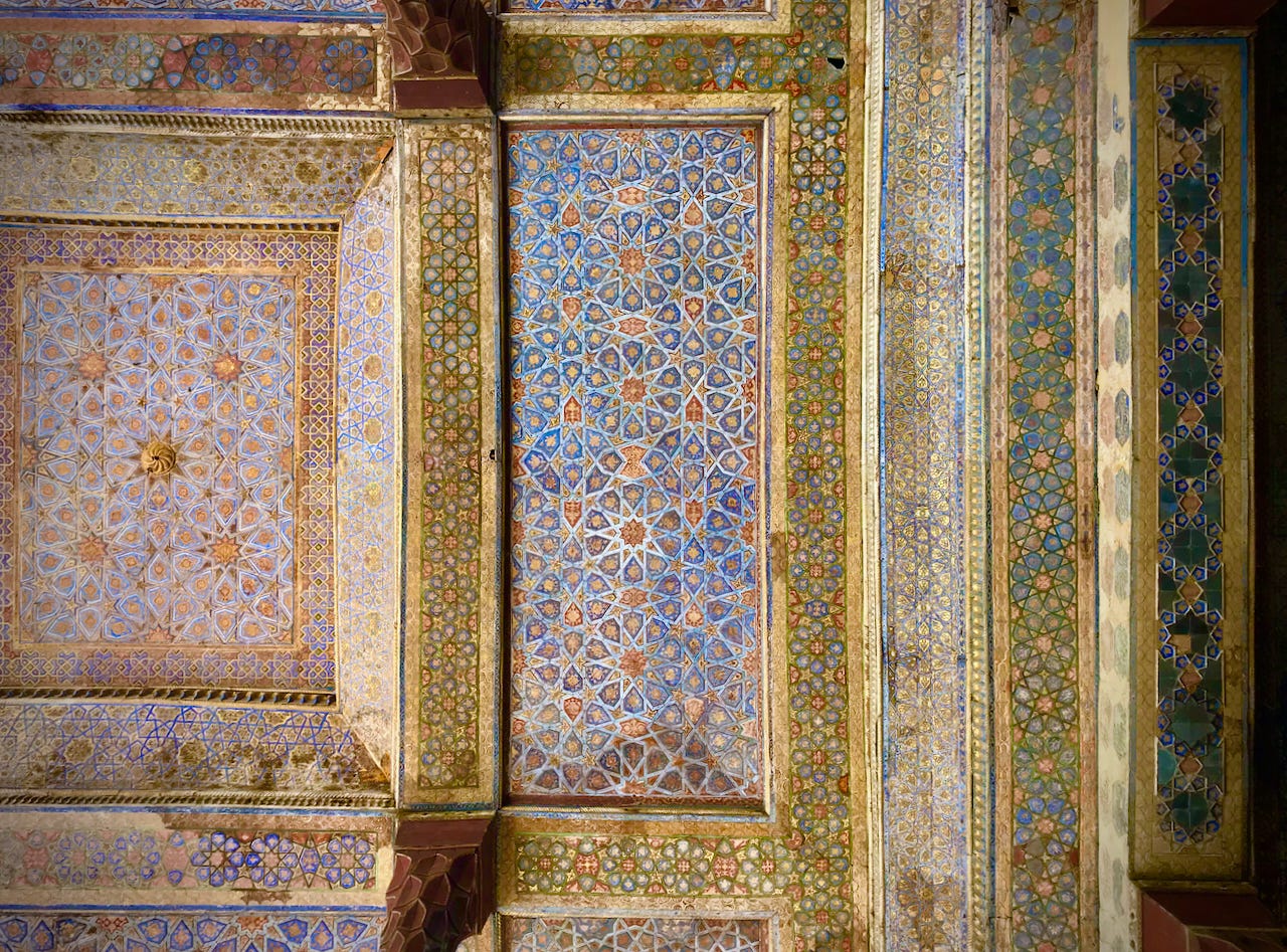 Ali Qapu Palace, one of the imperial seats of the Safavid Emperors, looks out over the square with a commanding view. But more beautiful, I thought, was the Chehel Sotoun (“Forty Columns”) royal complex, which had both extraordinary architecture (more amazing ceilings) and some richly mysterious and evocative early modern wall paintings.