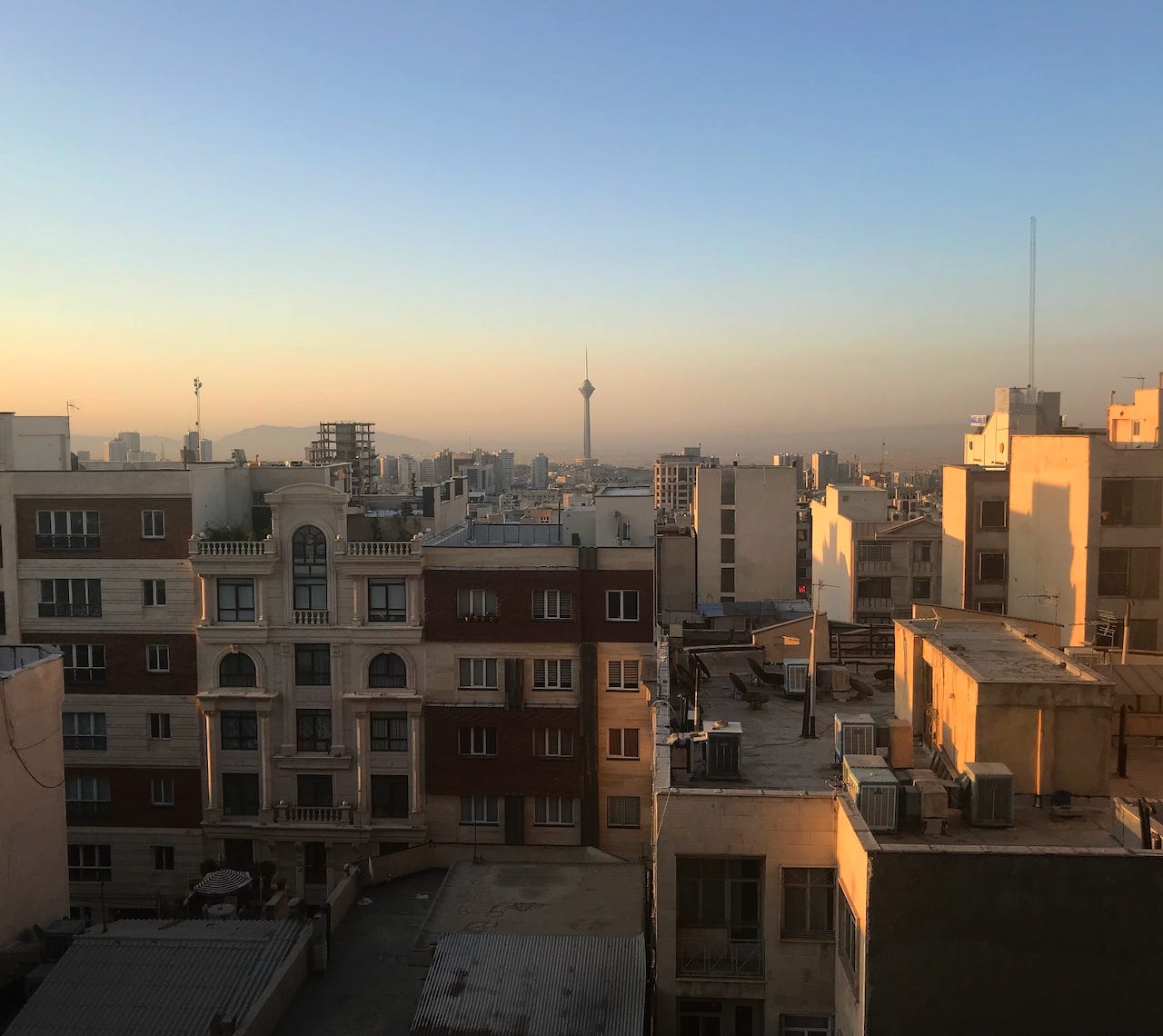 The view from my mother-in-law’s apartment in northwest Tehran, with Milad Tower, a focal point of the city’s urban core, visible in the distance.