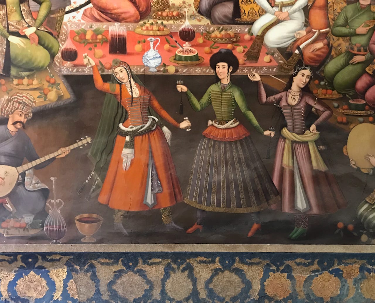 A detail of dancers and musicians in the painting of Abbas II entertaining the King of Turkestan. I am guessing that it may be Yalda night due to the prominent watermelon, but I might be wrong.